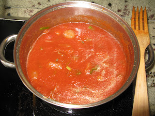 Pasamos la salsa de tomate por la batidora, pero antes retiramos la hoja de laurel.